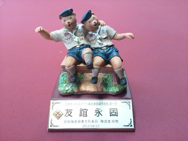 2013年夏の第16回日本ジャンボリー/<第30回アジア太平洋地域スカウトジャンボリーに参加した台湾隊(台北市第六團)スカウトがジャンボリー後に練馬地区を訪問しました。 これに先駆けて同年6月に台湾隊リーダーが下見で来日した際に、当団ボーイ隊の集会を見学され、そのお礼に同団から贈られた置物です。