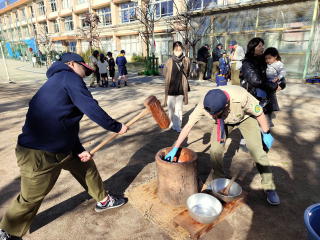 団行事(育成会主催行事)の「もちつき」を開催しました。 今年も、お餅をつくのみで食べることはせず、持ち帰りました。